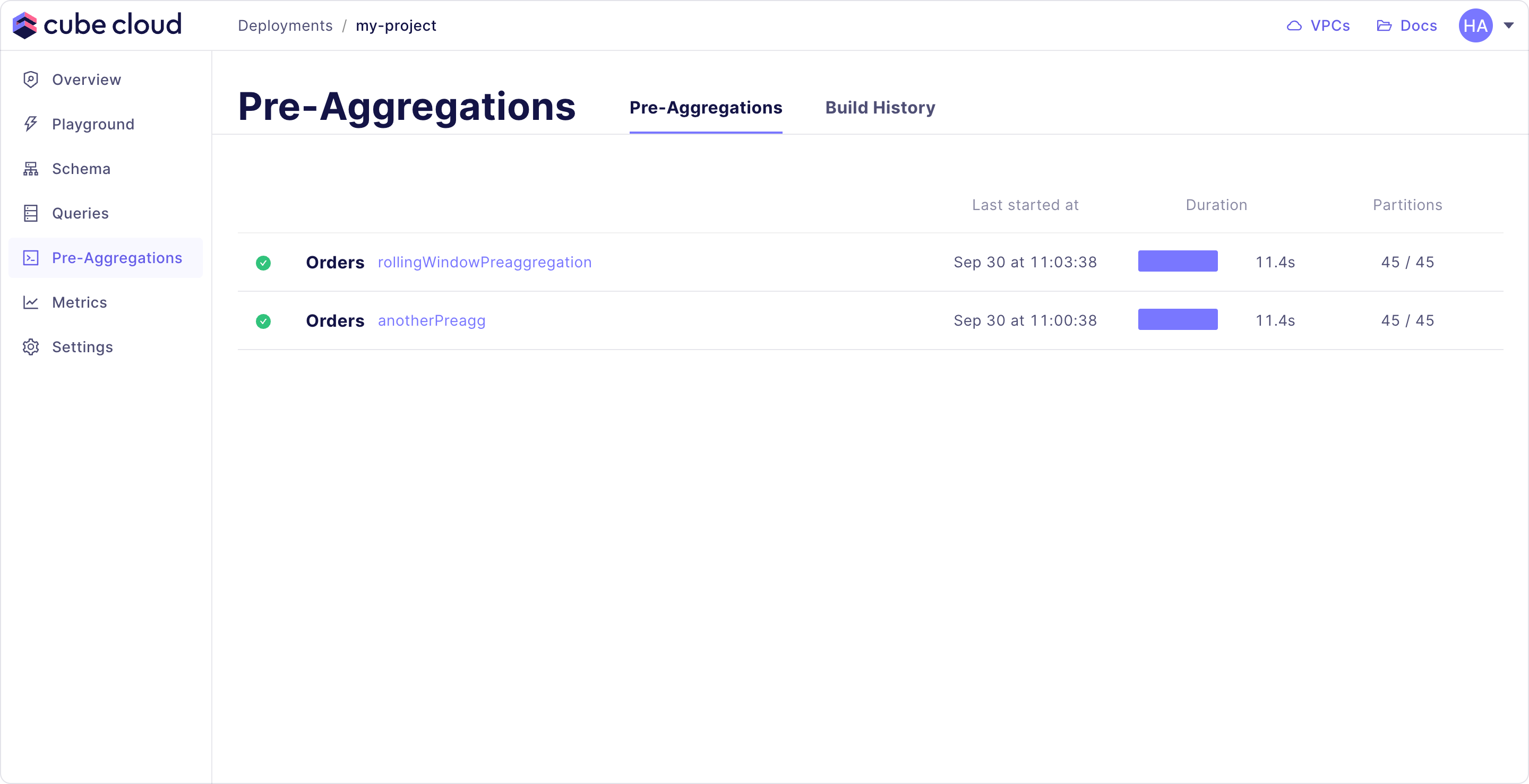 In Cube Cloud, we can check out the Pre-Aggregations page to see the status of all pre-aggregations in our Cube deployment, including whether they're building or not and even which of the partitions, if any, are being refreshed. In production, these pre-aggregations are kept up-to-date automatically for you.